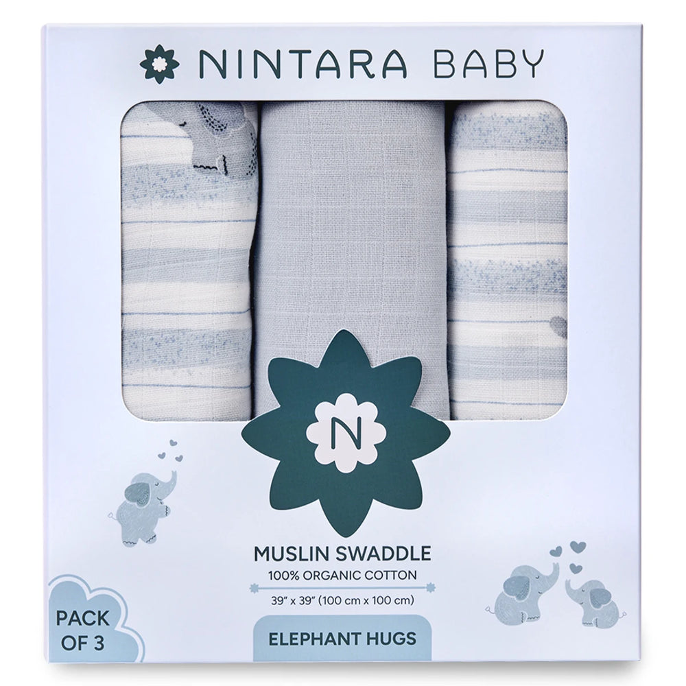 Pack of three organic cotton muslin baby swaddles with Elephant Hugs design